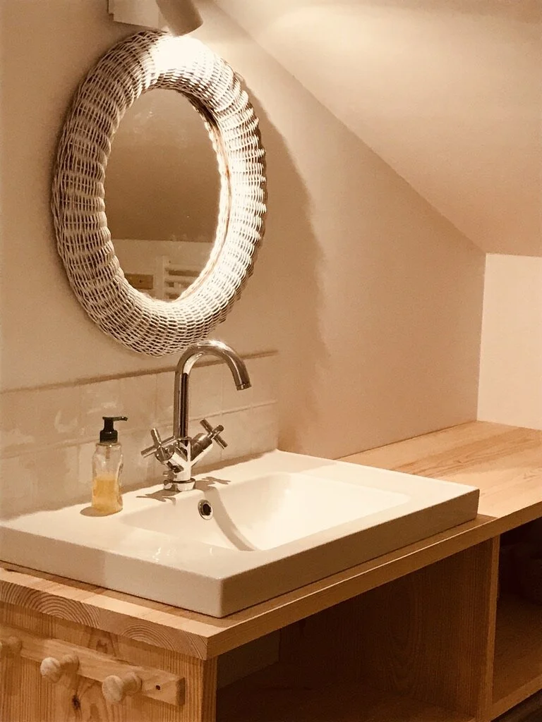 Attenante à cette chambre, une salle de bain dans un joli style « campagne-chic ». Les WC sont communs avec la chambre « A l’OCEAN ».