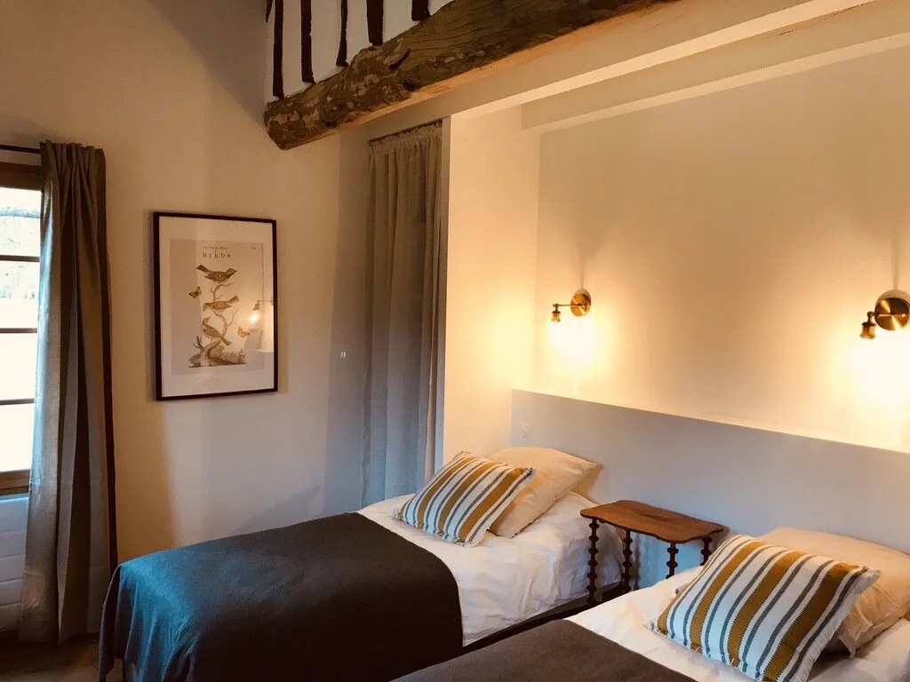Une chambre gaie aux poutres apparentes qui ont pu être préservées malgré les années. Ici les oiseaux sont à la fête, discrètement posés sur un meuble ou sifflotant juste de l’autre côté de la fenêtre, si vous l’ouvrez pour admirer la vue imprenable sur le parc.
