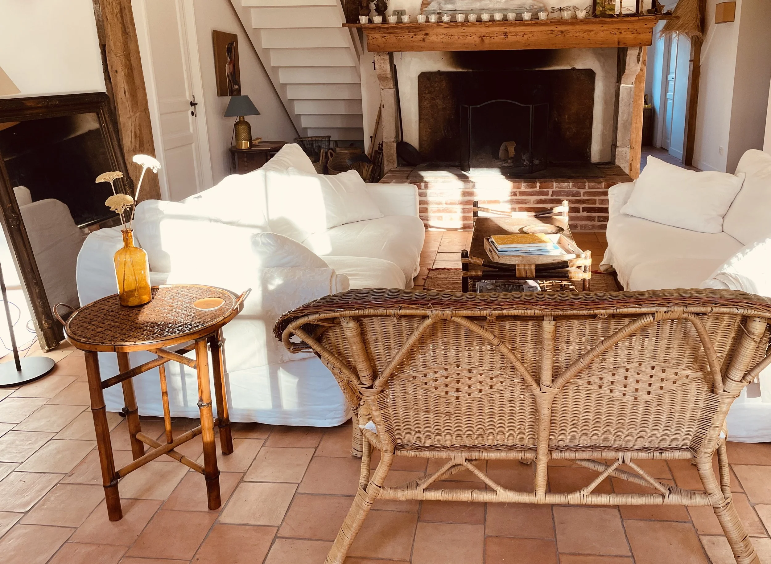 La vie s’organise autour de la grande cheminée centrale qui a pu être gardée et qui incarne indéniablement l’âme de la maison. L’hiver, les châtaignes sont cuites au feu de bois et vous serez accueillis au son des crépitements. Deux coins salons indépendants se partagent ce grand espace ouvert où se trouve également légèrement en retrait la salle-à- manger avec sa grande table fermière pouvant accueillir jusqu’à 12 personnes. La cuisine est semi-ouverte et donne directement sur la terrasse où vous pourrez également prendre vos repas et cuisiner à la plancha si le temps le permet.